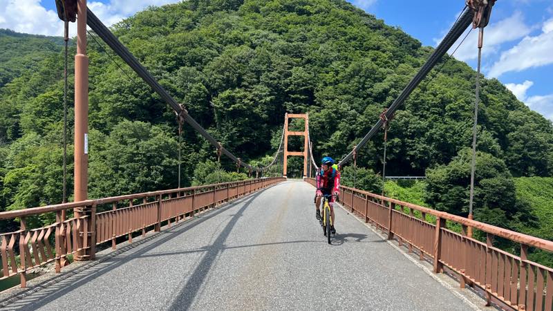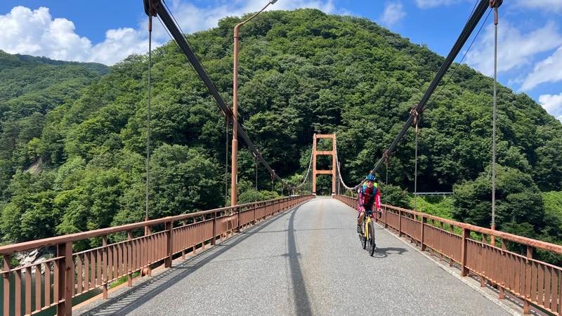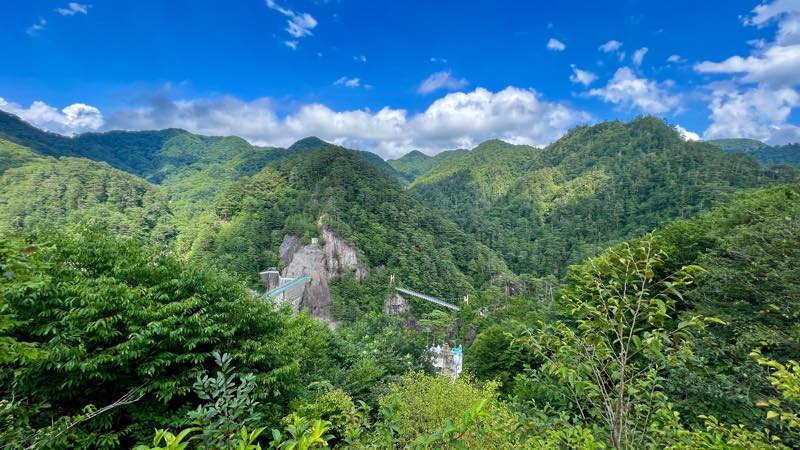 峡谷内にある川俣ダム正面の岸壁に架けられた吊橋「渡らっしゃい吊橋」からの眺望は絶景で、断崖を真近に感じることができます。
