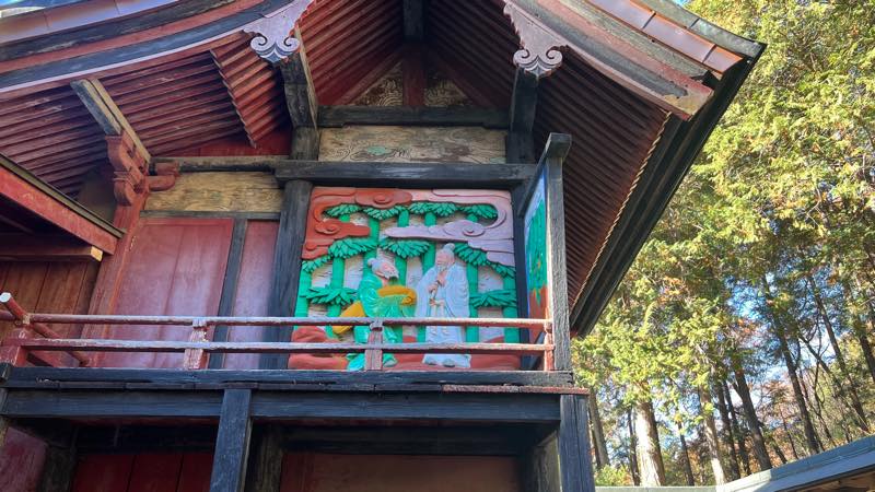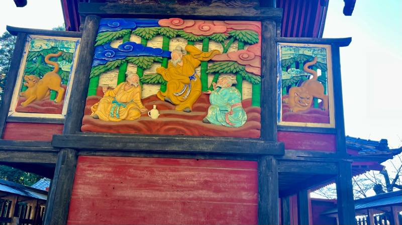 本殿の東・北・西の三壁に大変珍しい「竹林の七賢」の彫り物がありました。
