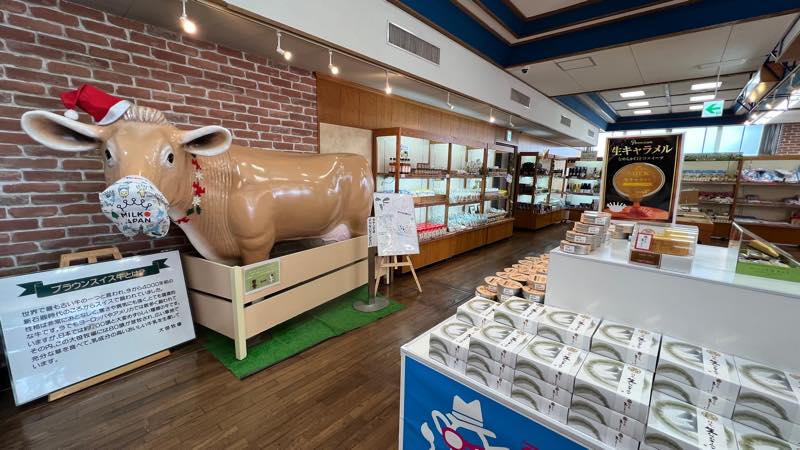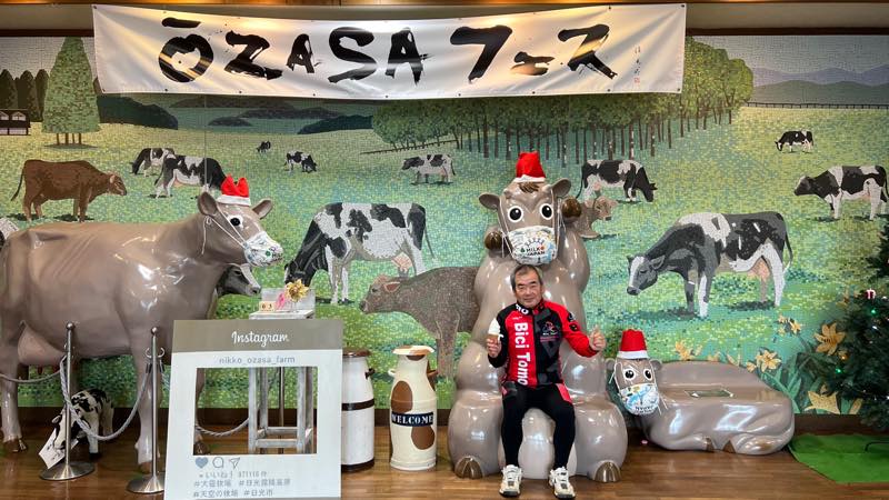 牛のマスコットの前で、記念撮影しました。