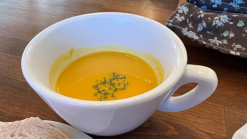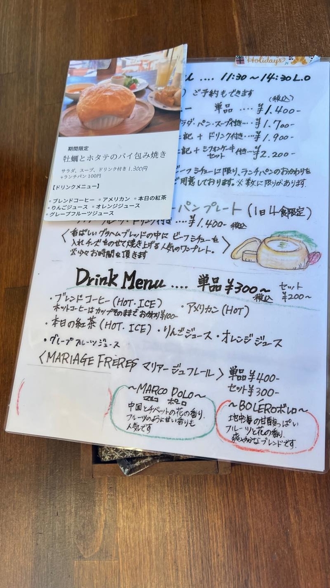期間限定は牡蠣とホタテのパイ包み焼きはサラダ、スープ、ドリンク付きで1300円です。