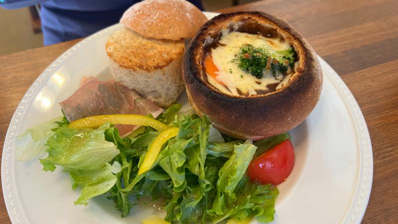 ビーフシチューのポットパンプレートは一日4食限定はサラダ、パン、スープ付きで1400円です。