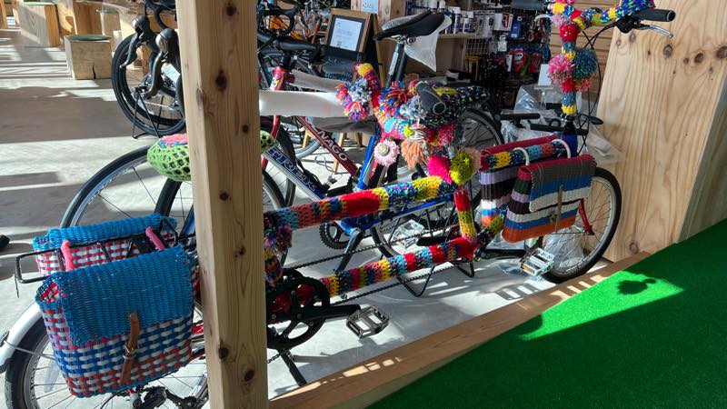 タンデム自転車が毛糸で綺麗にカバーしてありました。