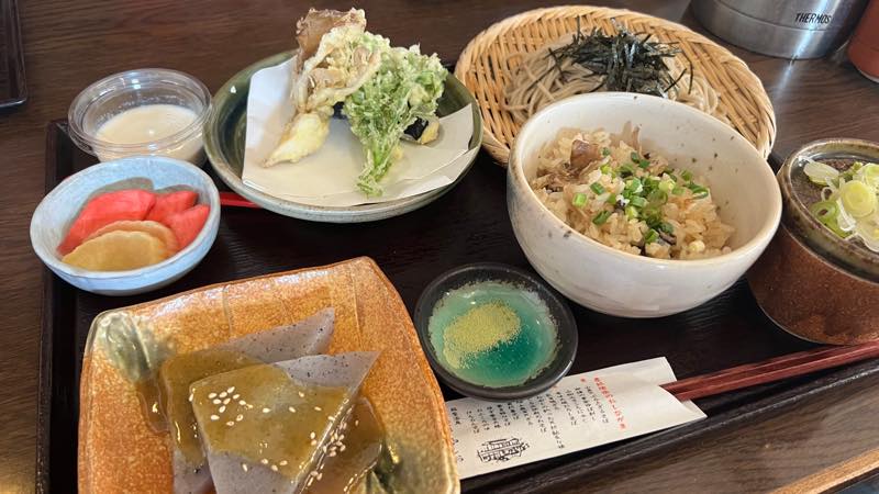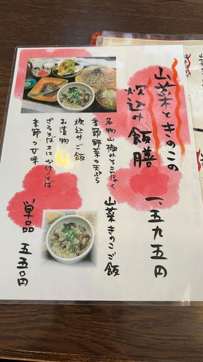 奥さんは、揚湯葉そば1210円、私はざるそば825円、Mさんは山菜ときのこの炊き込み御膳1595円を注文しました。