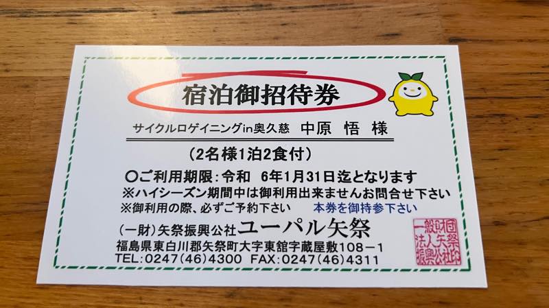 サイクルロゲイニングin奥久慈の3位の賞品の宿泊券が届きました。