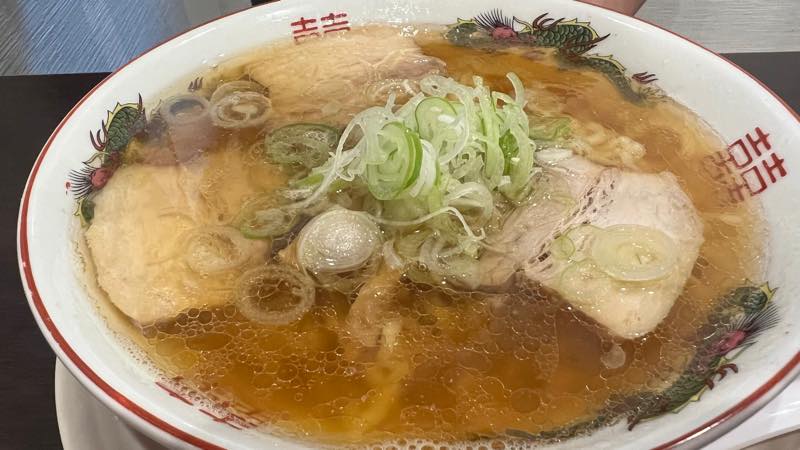 ラーメンは透き通ったスープに平打ち縮れ麺です。
