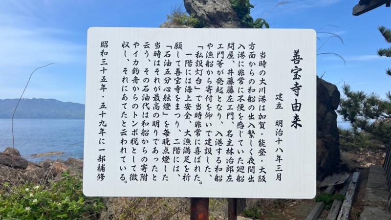 当時の大川港は加賀・能登・大阪方面からの和船の出入りがあり夜間出入国に非常に不便を感じていた廻船問屋が入港する和船や漁船から寄付を仰いで建設した。