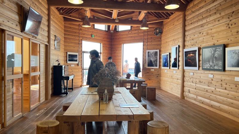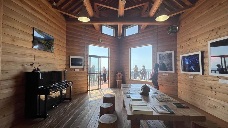 標高約850mに建つ山小屋風の建物。展望デッキから望む、両津湾、国中平野、小木半島などの大パノラマは感動的です。