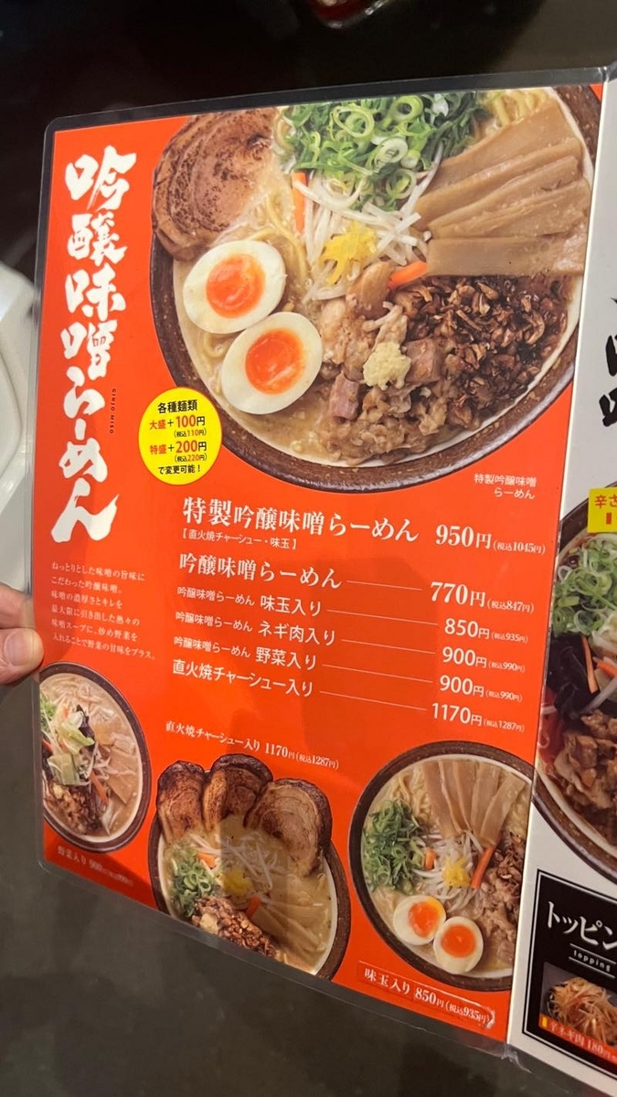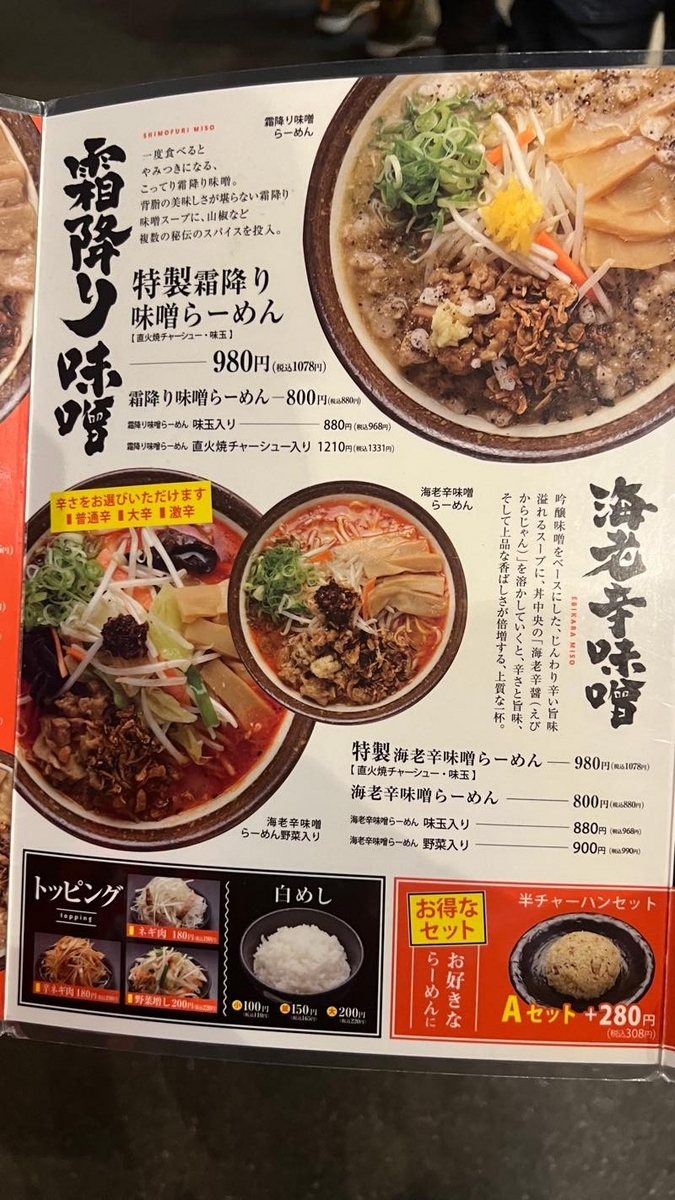特製吟醸味噌ラーメン1015円と特製海老辛味噌ラーメン1075円を注文。辛さは三種類から選べるので、無難に普通辛にしました。