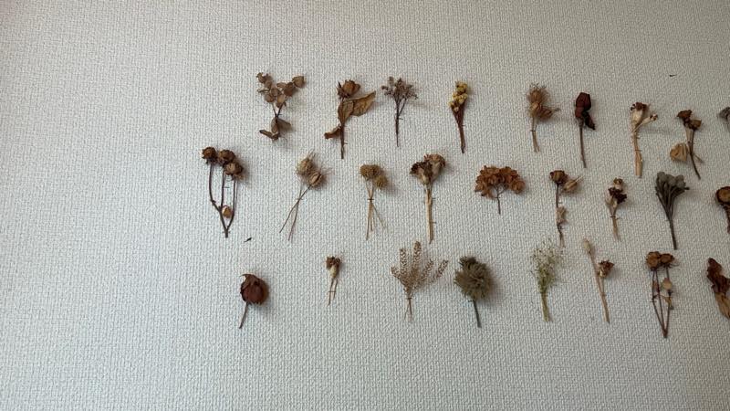 壁に押し花がホチキスで止めてありました。