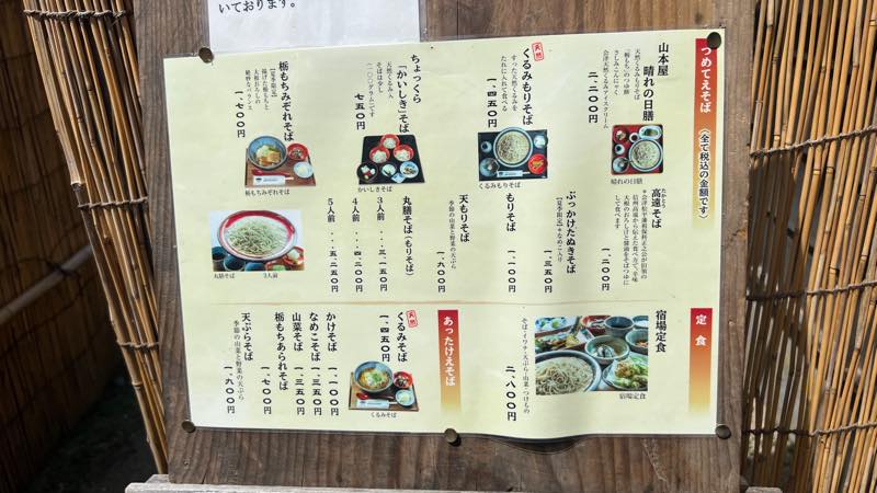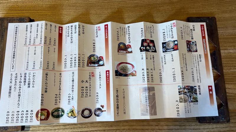 つめたてえそばは、山本屋晴れの日膳が天然くるみもりそば、栃餅のつゆ餅とさしみこんにゃく、会津天然くるみアイスクリームがついて2200円です。