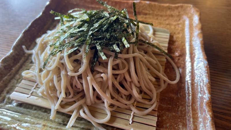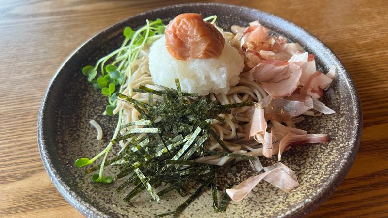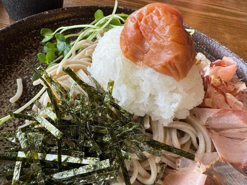 梅おろしそばは鰹節とかいわれと大根おろしと大きな梅がのっています。