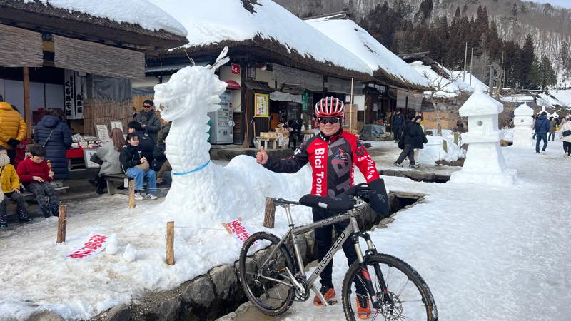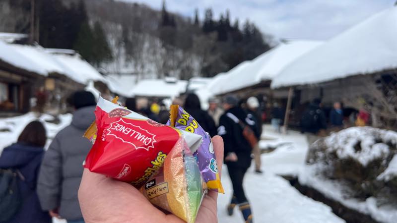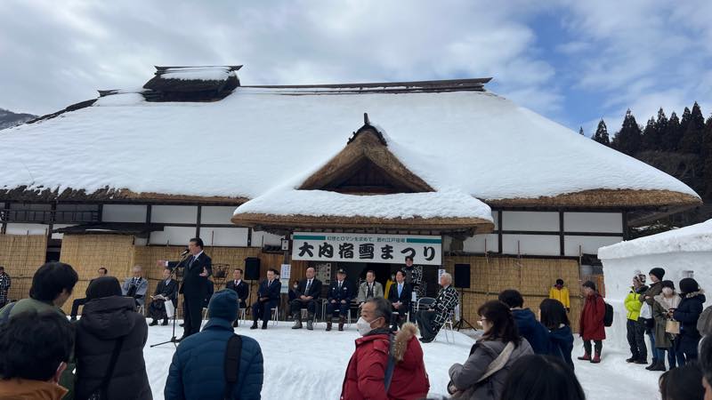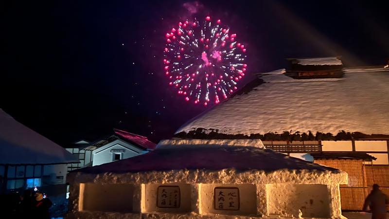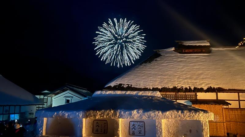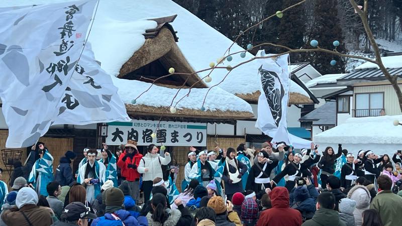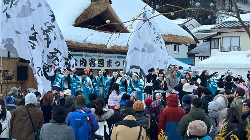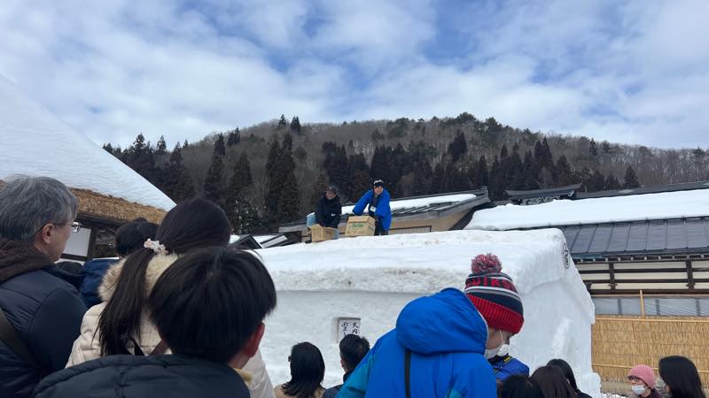 ぐし餅拾いです。両側の大きなかまくらの屋根の上から投げます。