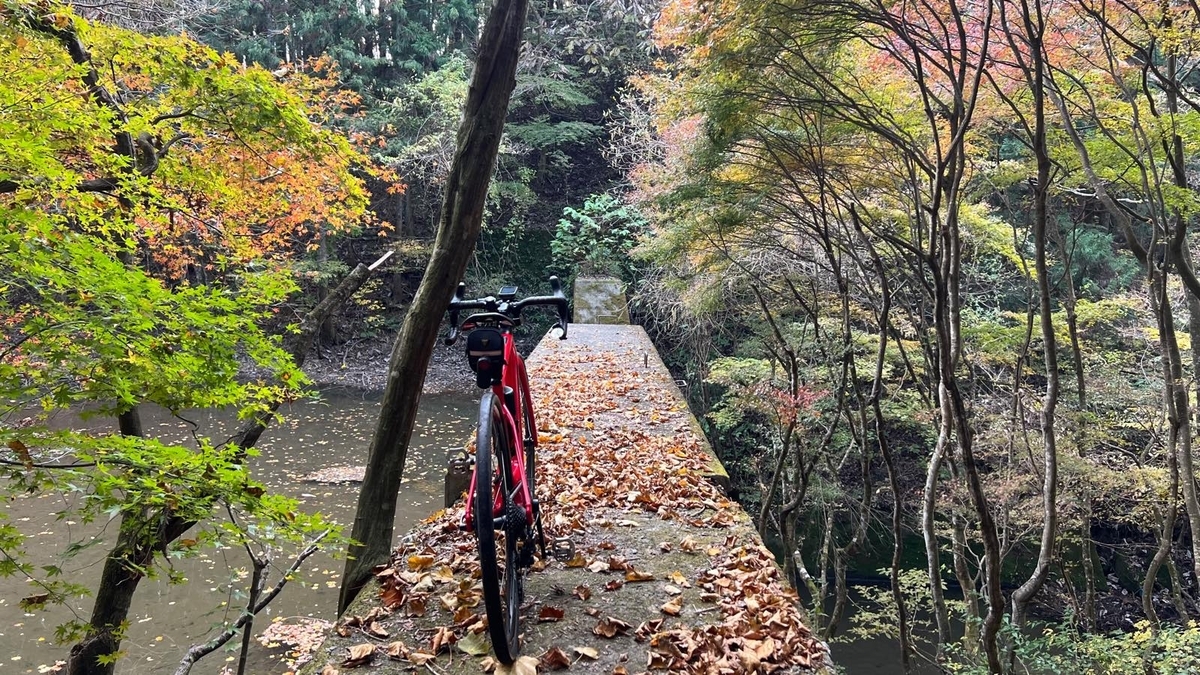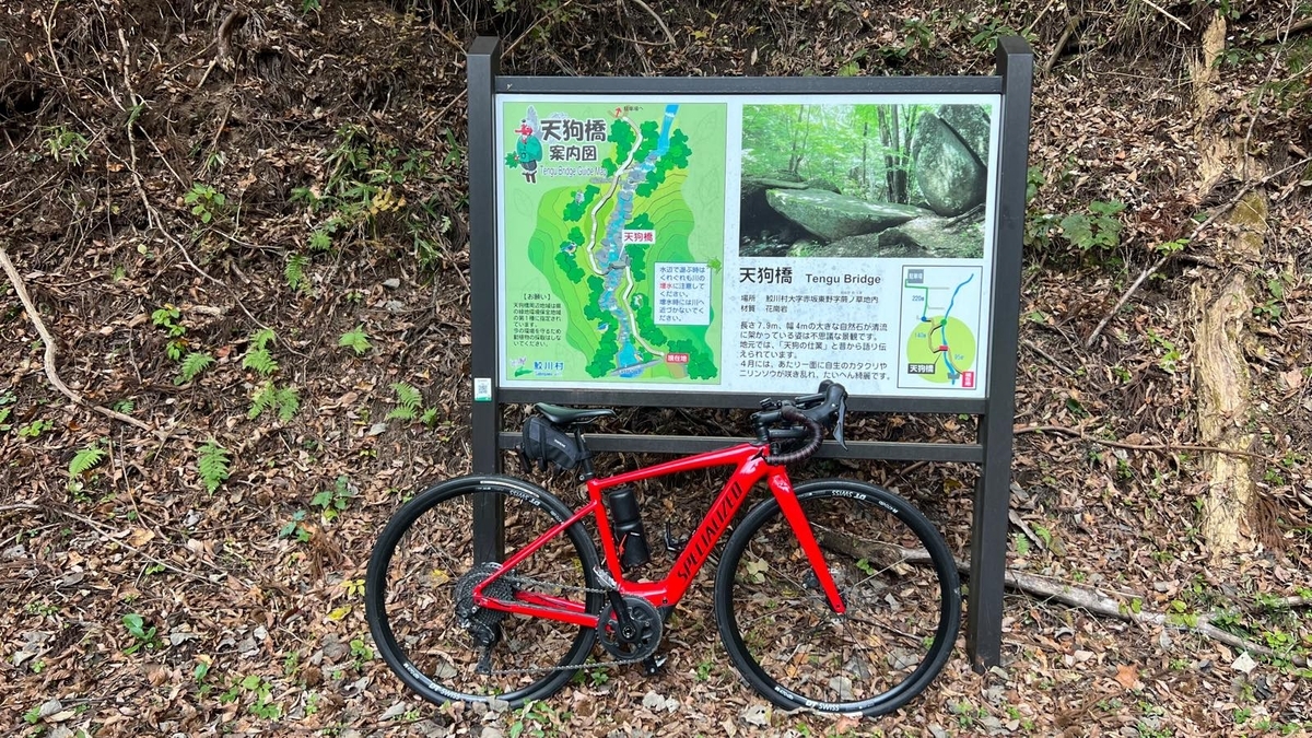 天狗橋の入り口までは急な坂が続いていました。 未舗装を走ってから少しあるって辿り着きました。 その昔、天狗がかけたと言い伝えられる「天狗橋(てんぐばし)」は、長さ7.9メートル、幅4メートルの自然の石橋です。橋の周辺はイヌブナやアカシデ、コナラなどの 古木がうっそうと生い茂り、涼しい空気が漂います。