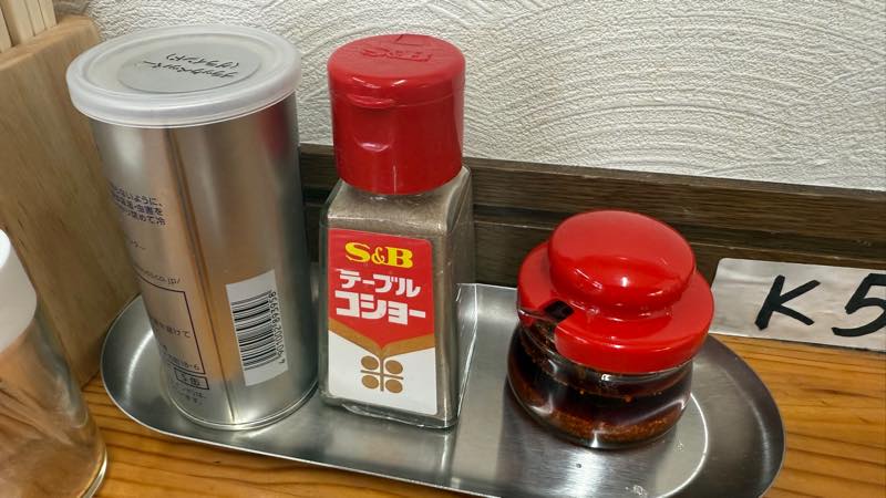 スパイスはブラックペッパーと胡椒とラー油が用意してあった。