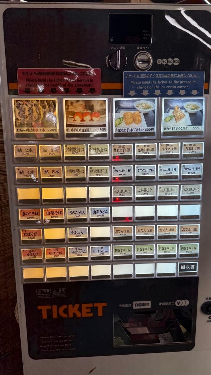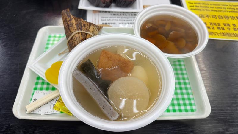 お腹も空いたので食堂で肉ちまききのこセット600円とおでん600円を購入した。